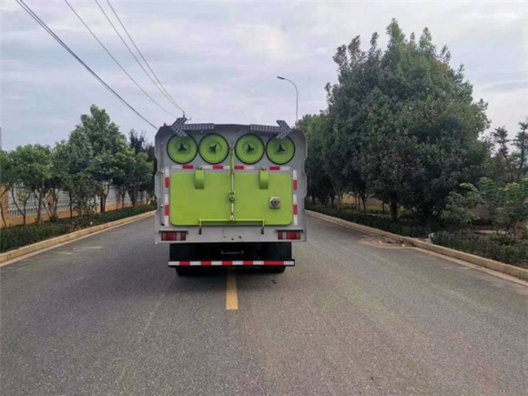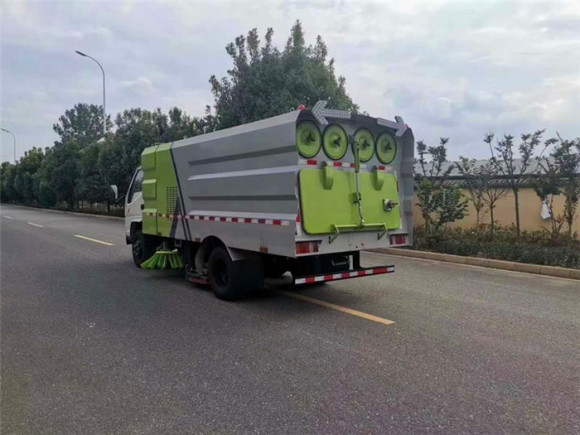 尾部的防護杠其它是一組噴頭,在吸完路渣后,對道路噴水降塵降溫處理。9. 整個車身在吸盤位置和尾部都安裝了夜間工作用的照明燈和監視攝像頭,增強的掃路車的夜間工作能力,而且實現了駕駛室監控清掃情況,